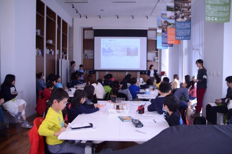 柏の葉のUDCK(http://www.udck.jp/)に専用の器具を持ち込んで実験を行います。試験管や試薬瓶が並び、気分はさながら実験室!