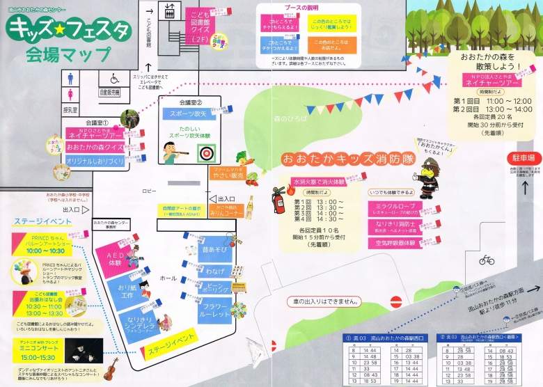 上記の画像は公式サイトに掲載されたパンフレットの表面ですが、1日に渡って消防隊やスポーツ吹き矢の体験コーナー、バルーンアートショーにコンサート、野菜やみりんの販売、昔遊び等々、さまざまなコーナーが設けられるようです。さらには、クイズ大会やネイチャーツアーも企画されていて盛りだくさんのイベントです。