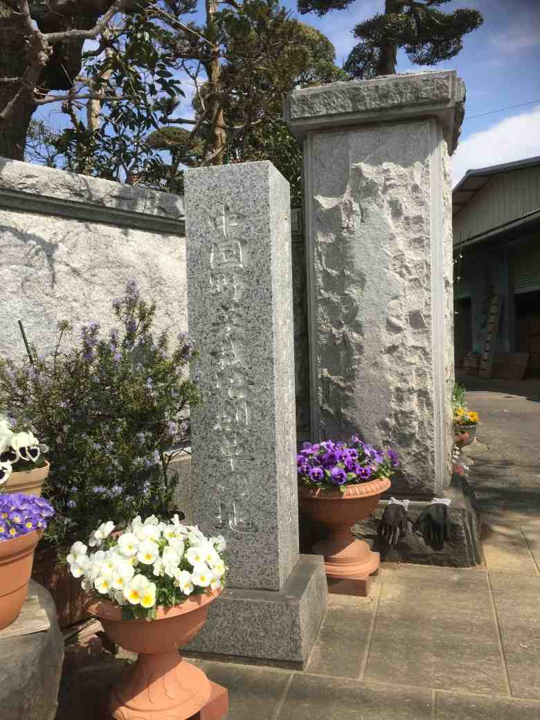 看板の前がお店の駐車場になりますが、道路を渡った向かい側に「中国野菜栽培草創の地」という石碑が立っています。一見すると普通の民家のガーデニングされた門で見落としやすいのですが特とご覧あれ。