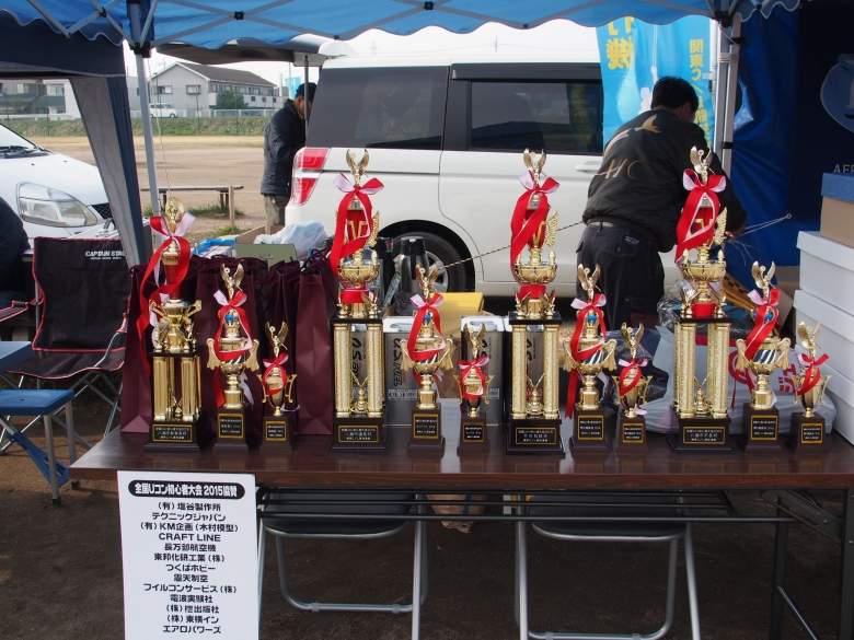 「Uコン飛行機が飛ぶ街八潮」にふさわしく、八潮市長杯、教育長杯、市議会議長杯が並んでいます。Uコン飛行機の大会に市がこれだけ応援してくれるところは、日本中で八潮市だけだと思います。Uコン飛行機は、50代の人が少年時代に大流行していましたが、現在は少数派のホビーになっています。しかし、八潮市では、毎年大会が行われ、じわじわとUコンファンが増え始めています。Uコン飛行機は「科学スポーツ」として位置づけられるので、青少年の健全育成に役立ちます。