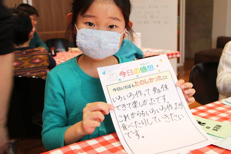 この日書いてもらった感想には、「ちらし寿司がおいしかった」というものから「いろいろ作れて楽しかった!」「これからもいろいろ食べたり、作ったりしていきたい」「パパとママに作ってあげたい」といった意見も多く、「作る」ことに興味をもった様子もうかがえました。