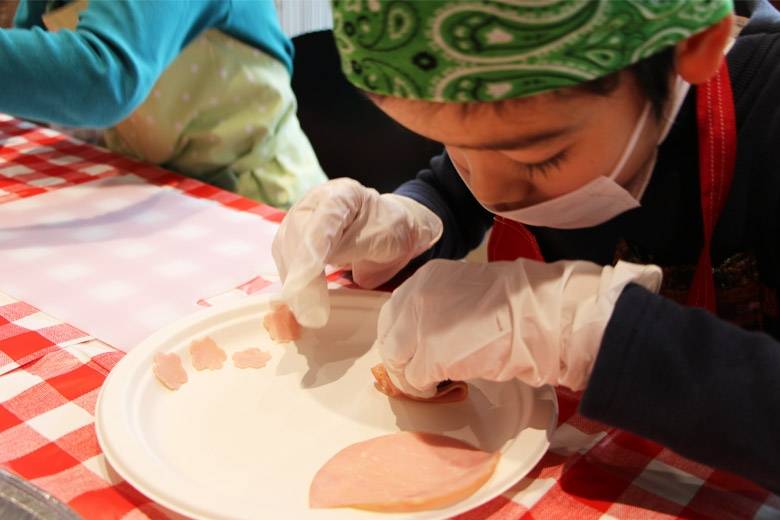 花型でくり抜いたハムは仕上げの飾り用にとっておき、余った部分をハサミで細かく刻んでご飯に混ぜます。