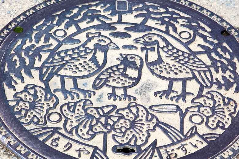 守谷の市の鳥「コジュケイ」が描かれたマンホール