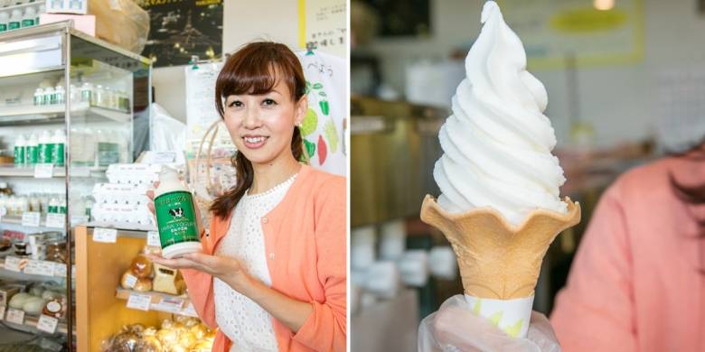 左)守谷すたいるでも人気の商品、「守谷さんちののむヨーグルト」 右)守谷さんちの牛乳やヨーグルトをつかったソフトクリームも絶品!