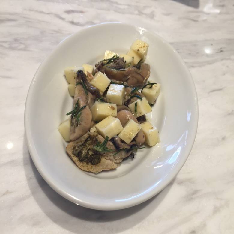 海洋深層水カキセンター作牡蠣のスモークと日本酒と同じ発酵物のチーズのコラボ。チーズはバイエルン産ステッペンチーズ。