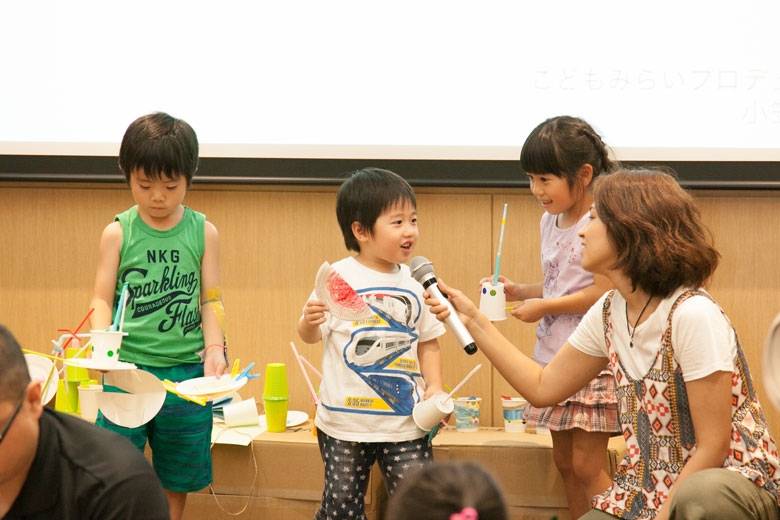 作品が出来上がったら前に出てきて、自分が何を作ったのか、どうやって遊ぶのかなどを発表していきます。紙コップとストローを使ってロケットを作った子、スイカを作った子、マラカスを作った子もいました。同じ素材だけれど、誰一人として同じものはありません。「工夫した所は、ビーズが無かったからストローを切ってビーズの代わりにした」など大人では考え付かないような発想で作品を作った子もいました。