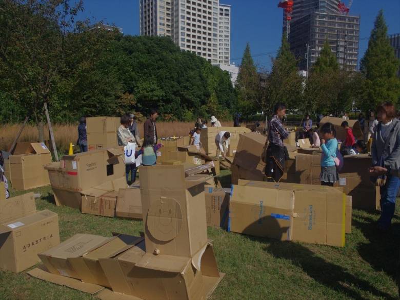 会場を入った先の広場では、未来こどもがっこう主催の「秘密基地づくり」が開催。大きな段ボールが大量に用意されていて、こども達は各自で自由にいろいろな秘密基地を造っていました。