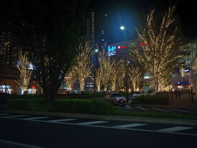 抽選会で当たった市民がカウントダウンとともに点灯ボタンを押すと駅前から西口ロータリーまで一斉に電飾が灯りました。