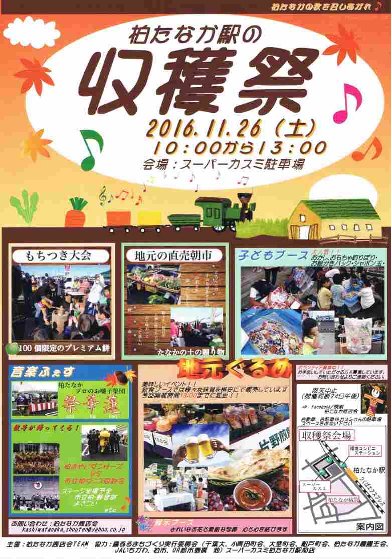 毎年恒例の柏たなか駅の年に一度の収穫祭が11月26日に開催されます。柏たなか駅周辺は農あるまちづくりをコンセプトにしており、定期的に地元農家とタイアップした企画が行われていますが、今回も地元農家の新鮮野菜の販売、屋台や出店、ステージも設けられてお囃子や軽音楽の演奏、柏おやじダンサーズVS市立柏ダンス同好会のダンスバトル等のイベントが開催されます。もちつき大会も開催され、つきたてのもちとして限定100個だけですが販売されるそうです。