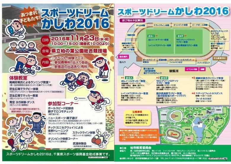 市役所のページによると、柏レイソルやNECグリーンロケッツ協力のサッカー教室やラグビー教室が企画されており元マラソン日本代表の尾崎好美さんと一緒に走るランニング教室もある模様です。