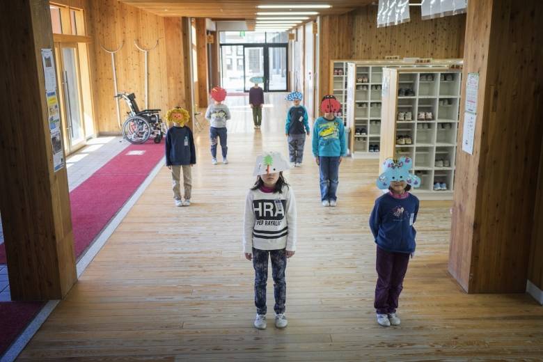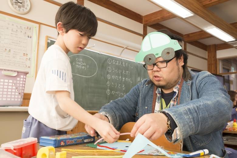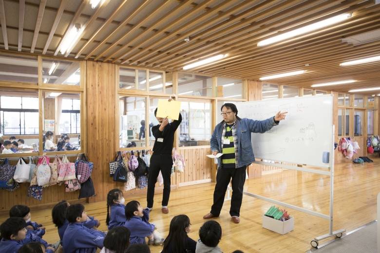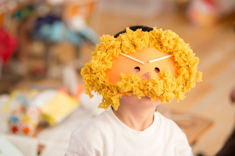 児童たちはアーティストの指導のもと日用品を用いて、動物、昆虫、車、建物など、人間以外に変身する仮面を制作しました。制作後には児童全員が仮面をつけて変身した状態で写真を撮り、児童たちにとって日常の社会生活を過ごす教室を、非日常の空間に一変させる飯野氏自身の写真作品として完成させました。