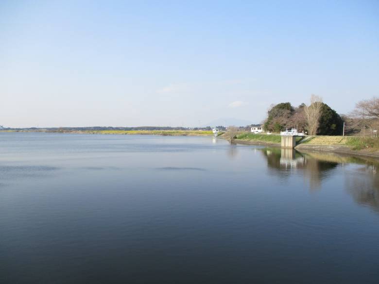 福岡堰から見る小貝川は、川ではなく広大な湖のようで、対岸に見える黄色い菜の花が鮮やかに風景を彩っていました。