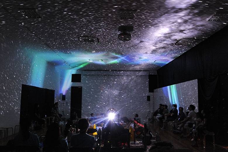 普段は結婚式のレセプションや展示会にも使われるというイベントスペースはカーテンで真っ暗にされ、その中に寝転がって参加できるスペースや椅子が用意されていました。その部屋の中で大平さんが開発した170万もの星空を映し出せるプラネタリウム「MEGASTAR」が投影されます。その満点の星空を眺めながら大平さんの話は始まりました。小さな星たちや遠くの星たちも映し出されているので、奥行きのある空が再現され、プラネタリウムが映す空に吸い込まれそうです。