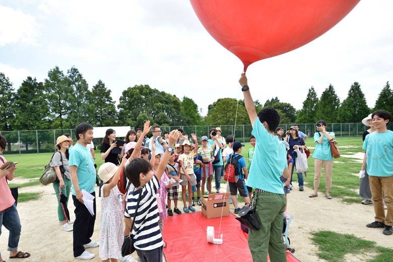 柏の葉公園に集まった子どもたちと一緒にカメラをつけた大きなふうせんを空に飛ばします。宇宙まで飛ばすには1時間くらいかかってしまうので、この日は紐をつけたふうせんを空高く飛ばし、みんなの住む街を映します。撮影した写真はその場でスクリーンに映して上映会。ごうごうという風の音も聞こえ「上空ってこんなに風が吹いているんだ」ということがわかります。