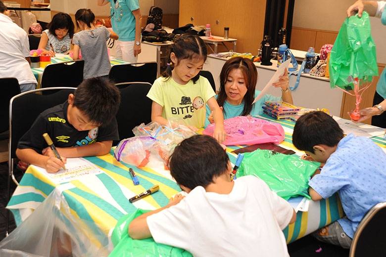毎回50人参加できるこのワークショップは3回開催されましたがどれも満員です。「何回失敗してもいいからやってごらん」と話す岩谷さんは子どもたちに簡単なイラストが書いてある説明書しか渡しません。自身が100回以上失敗したというだけあり、失敗の中から成功までの道を探ってほしいというわけです。色とりどりのポリ袋を切りパラシュートを作ります。「どうやるのー!?」と言っていた子どもたちも少しだけ大人の手助けを借りながらも自分で完成させ、最後に上から落としてゆっくりとパラシュートが開く様子を見て満足そうでした。