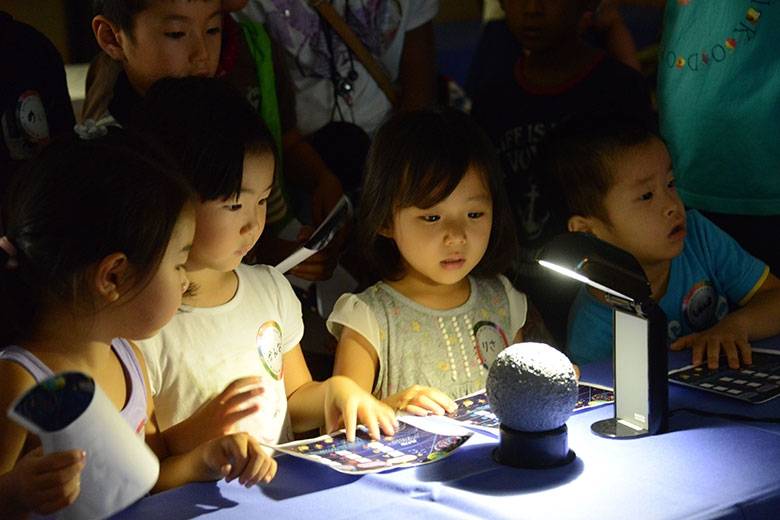そのほかにも、自分で色とりどりに塗った宇宙の絵を光にかざすことで万華鏡のように楽しむことのできる「宇宙をつくろうワークショップ」やクイズ形式で月の砂について学べるワークショップも一日中大にぎわい。子どもたちが一生懸命取り組んでいる横で、多くの保護者たちが「これは夏休みの自由研究にちょうどいい」と話していたのが印象的でした。