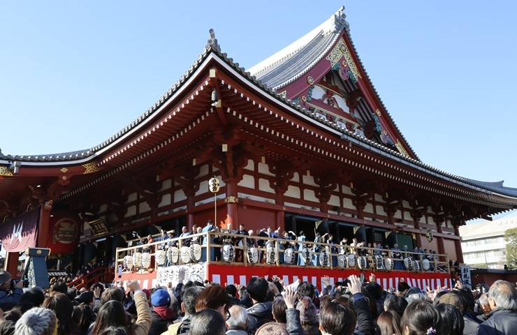 浅草寺の豆まきは、「観音さまの前には鬼はいないこと」にちなみ「鬼は外」とは言わず、「千秋万歳福は内」と発声するのがならわし。