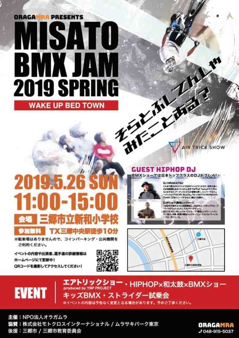 2019年5月26日(日)に三郷市の新和小学校にて『MISATO BMX JAM 2019』が開催決定!オープニングアクト・エアトリックショー・BMXフラットランドショー・HIPHOP DJ TIME・和太鼓演奏HIPHOPのDJには人気HIPHOPグループ餓鬼レンジャーのDJオショウ、DJヒラカツと日本トップレベルのDJをブッキング。BMXショーと市内和太鼓チーム豊屋がコラボ演奏を行います。