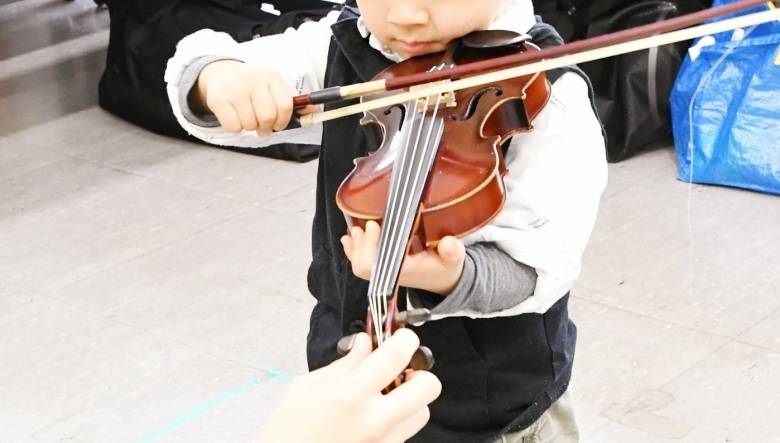 【第二部】は、子どもが楽器に触れる体験時間。「バイオリンやってみたかった!」の憧れが叶う素敵なひとときです。もちろん、大人も一緒に!