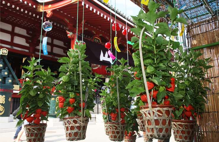 7月10日に参拝すると、4万6千日お参りしたのと同じご利益があるとされ、古くからこの日の参拝も盛んでした。現在は境内にほおずきを売る店が約100も並び、風鈴の涼しげな音色、ほおずきの鮮やかな朱色、そして色とりどりの浴衣姿でそぞろ歩きを楽しむ人々で、浅草寺は下町の市らしい華やぎを見せます。