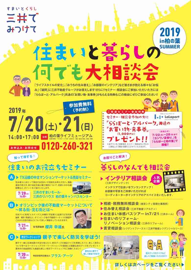 ライフスタイルの変化」、「おうちの住み替え」、「お部屋のインテリア」など皆さまが抱える様々な「お悩み」・「疑問」に三井不動産グループがお答えします!さらに!!セミナー・相談会にご参加いただいた方には「ららぽーと・アルパーク」共通の「お買い物・食事券1000円分」がもらえる特典も!この機会にぜひご参加ください!!