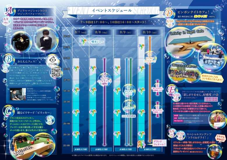 今年は会場が海の中に様変わり。光るクラゲも日本初登場!?美味しいグルメも盛りだくさん!日替わりフードもお見逃しなく。ここのしかない海の中で味わうグルメ&ビアを是非ご堪能下さい。光と音に彩られ、空高く舞い上がる華麗な噴水ショーは、ナイトカフェの風物詩。今年はミニステージでダンスイベントも開催!毎年大人気のウォーターアトラクションや、かわいい写真が撮影できる天使の羽噴水もお楽しみに!
