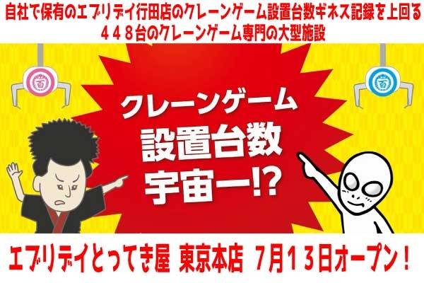 1店舗当たりのクレーンゲーム設置台数が、240台でギネス世界記録に認定されている「世界一のゲームセンター エブリデイ行田店(埼玉県行田市)」を運営する株式会社東洋(本社:埼玉県北本市/代表取締役社長 中村秀夫)は、自社で保有のエブリデイ行田店のギネス記録を上回る、クレーンゲーム設置台数448台のクレーンゲーム専門の施設【エブリデイとってき屋 東京本店】を2019年7月13日(土)、オープンしました!