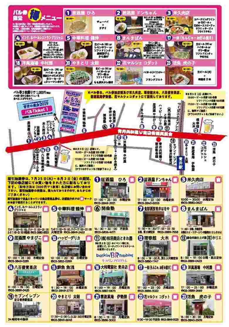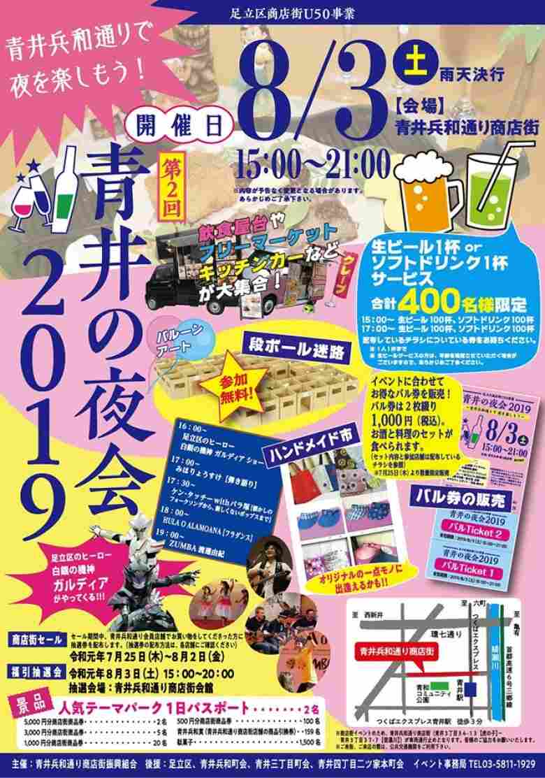昨年に続き8月3日(土)15時から青井兵和通り商店街の青井の夜会 が開催されます。7月25日(木)から数量限定のバル券販売と抽選券配布開始。当日はバル、キッチンカー、抽選会、ヒーローショーなど他にも様々。詳しくはチラシをご覧下さい。
