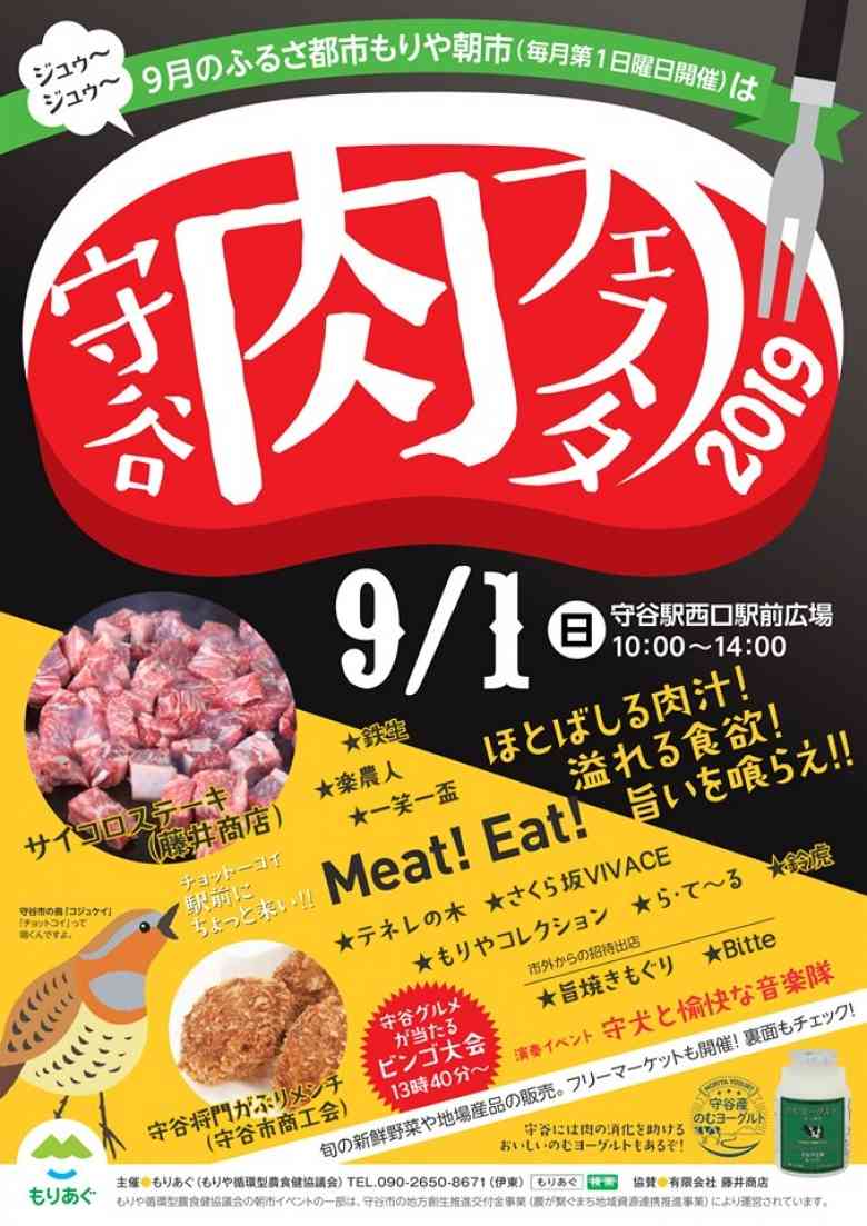 毎月第1日曜日に守谷駅西口駅前広場で行われている「ふるさ都市もりや朝市」。9月は「肉フェスタ」と題して、市内のお肉グルメが大集合。ほとばしる肉汁に溢れる食欲、旨い肉を堪能しましょう! 食べ物だけではなく、ビンゴ大会や人気の守犬ちゃんが登場する演奏会もあるそうです。もちろん、定番のフリーマーケットも。また、イベント当日には守谷駅東口側広場(アワーズ守谷駐車場の斜め向かい)にて、「第六回守谷灼熱の雪合戦」が開催されます。そちらも、一緒にお楽しみください!!