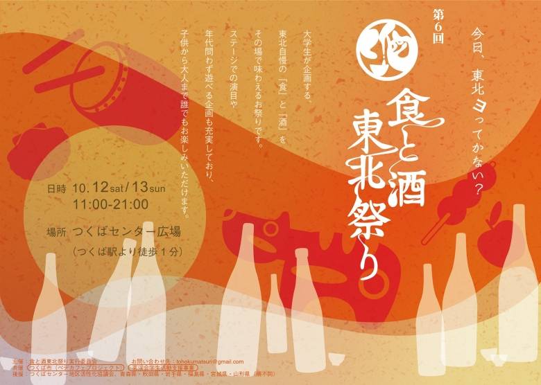 2019年10月12日(土)と10月13日(日)、つくば駅すぐのつくばセンター広場にて「第6回 食と酒 東北祭り」を開催!このイベントは、筑波大学の学生が企画・運営する東北復興応援イベントです。東北6県からの出展者によるグルメをはじめ、現状の震災情報を掲示するブース展示や、東北の団体、筑波大学のサークルによるステージ企画、ワークショップなどが催され、大いに賑わいます。東北のおもちゃづくり体験などのキッズコーナーもあり、小さな子ども連れでも気軽に楽しめます。