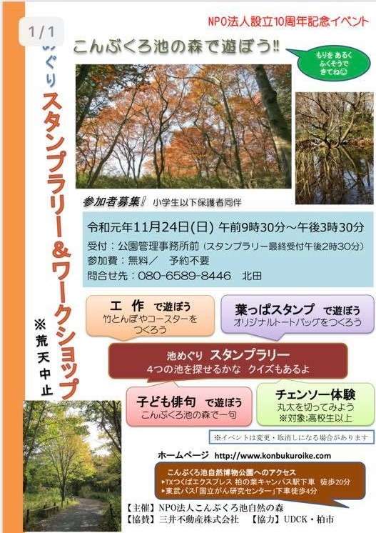工作教室で竹とんぼやコースターを作ったり、落ち葉のスタンプで、オリジナルトートバッグを作ったり、楽しい企画がいっぱい。11/24は、是非こんぶくろ自然博物公園まで遊びにいってみよう。