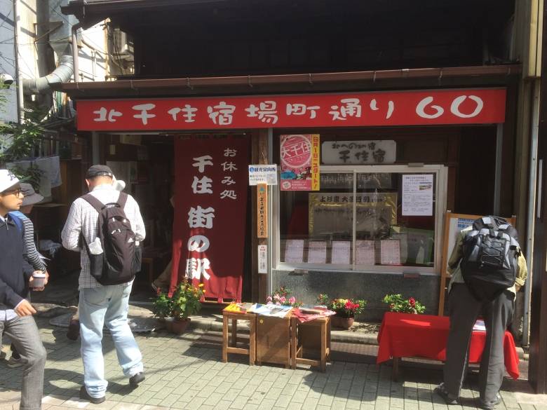 歩いていると、地元の住民だけではなく観光客も多く目にします。歩みを進めると、ガイドマップのような物を手にしたひとたちが立ち寄っている「千住 街の駅」なる場所があったのでのぞいてみました。