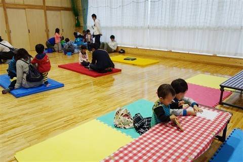 2階の児童館(遊戯室)ではぬりえやお絵かき、ビニールプールでつりをしたりと親子で遊べるコーナーも。この日は雨のせいもあり、たくさんの親子がいました。