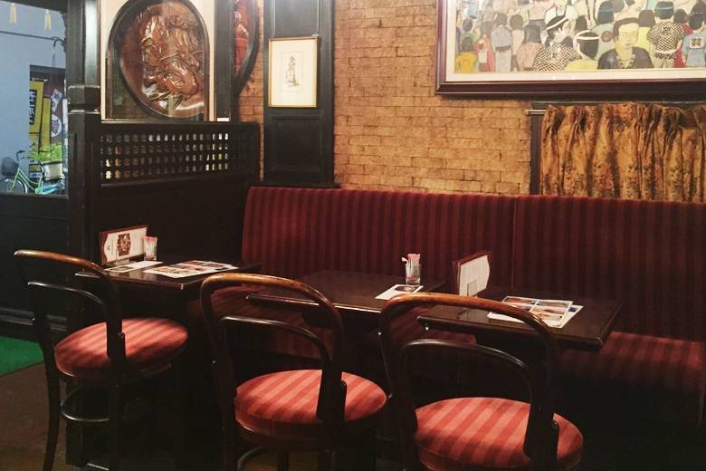 入口に何席かあって、一段上がると、大きな鏡やシャンデリアなど華やかな空間が広がります。私が案内された入口付近は、壁がヨーロッパの通りを舞台のセットにしたような作りになっていました。石作りの壁やカフェカーテン、街頭風の照明など。椅子のストライプもいい感じです。