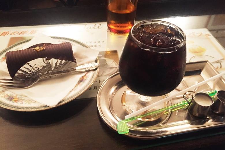 ダッチコーヒーは、氷とコーヒーが別に運ばれてきて、お店の方がテーブルで注いでくれます。後味がすっきりしていて、何倍でも飲めそう。ケーキはお店と同じ名前の名物「アンヂェラス」(330円)をいただきました。チョコとホワイトの2種類が定番ですが、この日は季節限定の“塩キャラメル”を。ロールケーキが濃厚なバタークリームでコーティングされていて、小さめサイズだけど満足感があります。