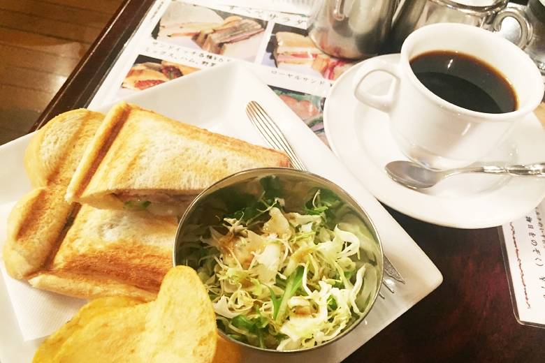 注文したのは、TVでも紹介されたことがあるというローストポーク入りの「ホットサンド」(500円)とブレンド珈琲(480円)。ホットサンドにはサラダとポテトチップスがついてました。とろーりチーズと厚めのローストポークが美味しい! 珈琲は、毎日お店で焙煎されているそうですよ。席の場所によるかもしれませんが、お客さんのざわざわとした話し声もほどよいBGMになって、昔からの社交場というような雰囲気が楽しめました。