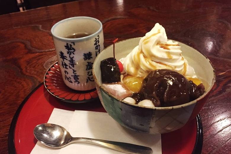この日いただいたのは、名物「クリームあんみつ」に白玉をプラスした「白玉クリームあんみつ」(950円)。ソフトクリームたっぷりで、沖縄産の黒糖を使った自家製あんこに、フルーツ、白玉、かんてんが入っていました。あんこの甘さはなんだか癒されます。