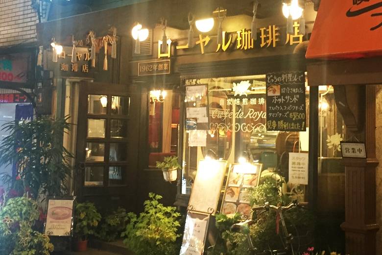 レトロな外観と、外から窓ごしに見える焙煎機が目印の「ローヤル珈琲店」。創業は昭和37年です。辺りが暗くなってくると、中からもれてくるあたたかい光と、なにやら懐かしい雰囲気に引き寄せられます。