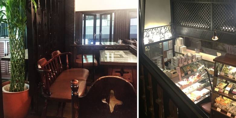 中に入ると左手にケーキのショーケース、奥には客席が見えます。この日は階段をあがって2階に案内されました。仕切りや植木などのおかげで、隠れ家のような雰囲気。読書や静かな会話を楽しみたい場所です。2階は天井が低いのですが圧迫感はなくて、間接照明のやわらかい光が落ち着きます。