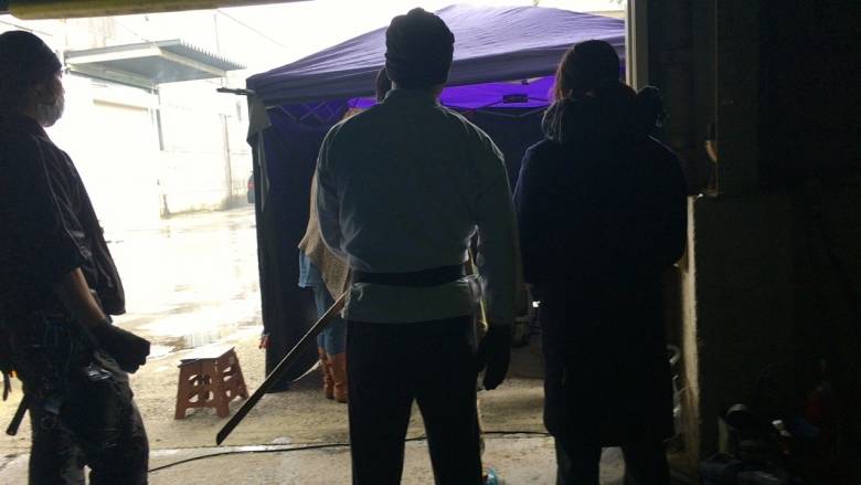 殺陣師の後ろ姿。その向こうでは監督がモニターを凝視中