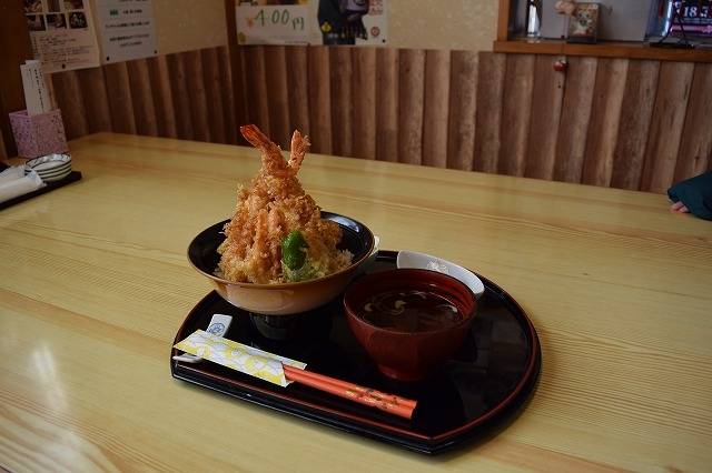 大きな海老を鬼のツノに見立てた、その名も鬼天丼!子供達は迷うことなくいきおいよくガブリといきました(笑)。エビのプリプリとした身と、衣のサクサクの食感のバランスが最高です!これでランチ1,100円、納得プライス!!(笑)