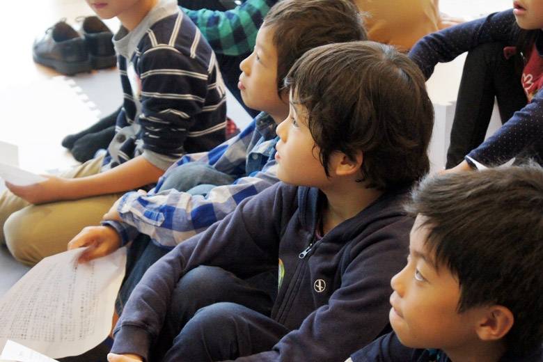 今回の講師は東大、慶応大、東芸大の学生さん。まずは、全員スライドの前に集まって説明を聴きます。この日の対話のルールは3つだけ。